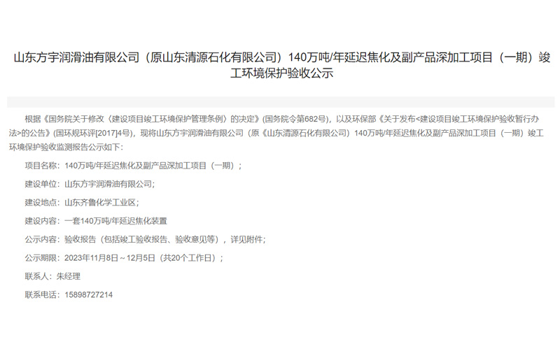 山東方宇潤滑油有限公司(原山東清源石化有限公司)140萬噸/年延遲焦化及副產品深加工項目(一期)竣工環境保護驗收公示