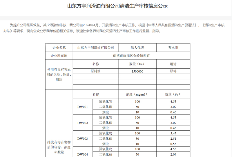 山東方宇潤滑油有限公司清潔生產審核信息公示